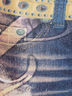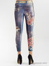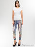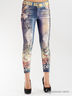 Леггинсы бархатные с люрексом, стилизованные под винтажные джинсы. Леггинсы украшены ярким принтом в виде гитары, цветов и надписей инкрустированных стразами.
