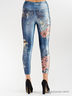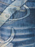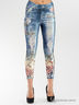Капри, стилизованные под винтажные джинсы, украшены принтом с изображением гитары, гербов и роз, а также надписями из золотых страз. Ткань из бархата с люрексом.