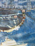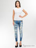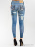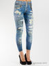 Леггинсы стилизованные под винтажные джинсы, украшенные накладными карманами, металлическими заклепками и медной цепочкой с бляшкой.