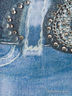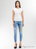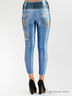 Леггинсы длиной 7/8, стилизованные под джинсы. Леггинсы украшены ярким принтом в виде цветов и надписей и крупными стразами, выложенными в форме ремня. Леггинсы выполнены из ткани с добавлением люрекса.
