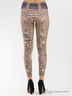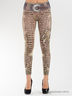 Леггинсы стилизованные под джинсы. Леггинсы украшены ярким принтом в виде цветов и надписей и крупными стразами, выложенными в форме ремня.
