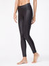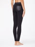 Легинсы женские из трикотажного полотна, комбинированные. Передние половинки, пояс и два накладных карманы сзади выполнены из трикотажного полотна с эффектом мокрой кожи. Задние половинки выполнен из однотонного трикотажного полотна. Широкая резинка на поясе обеспечивает им идеальную посадку и гарантирует комфорт.