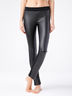 Легинсы женские из трикотажного полотна комбинированные. Передние половинки выполнены из трикотажного полотна «под искусственную кожу» стеганное. Задние половинки и пояс выполнен из однотонного трикотажного полотна. Верх изделия обработан поясом с широкой резинкой внутри. По боковым швам и шву притачивания пояса проложена отделочная строчка с узкой расстановкой игл.