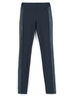 Леггинсы женские из однотонного трикотажного полотна. По боку вдоль ножки лампас из кожи переходящий вверху в фигурную кокетку. По шву лампаса и кокетки - отделочная строчка. Верх изделия обработан поясом с эластичной тесьмой внутри.
