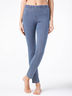 Леггинсы женские из трикотажного полотна "Джинс" в полоску. По задним половинкам притачные кокетки. По передним половинкам имитация гульфика и боковых карманов, возле боковых швов установлены 2 хольнитена. Пояс обработан эластичной тесьмой швом в подгибку. По швам притачивания кокеток передней и задней половинок, боковым швам выполнена двойная отделочная строчка, по средним швам выполнена одинарная отделочная строчка.