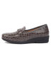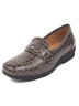 Лоферы из искусственной кожи с выделкой под кожу крокодила, эластичной вставкой и декоративной пряжкой. Мягкая стелька и подкладка из синтетики. Гибкая подошва с каблуком-танкеткой 3,5 см. Комфортная полнота для широкой стопы.
