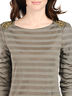 Детали: круглый вырез; длинный рукав; оригинальный принт - полоска; на плечах декоративные нашивки с бусинами и пайетками