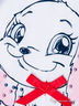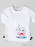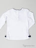 Детали: округлый вырез горловины, застежка на кнопки на спине, длинный прямой рукав, по бокам изделие дополнено двойными кулисками с декоративными бантиками, полочка декорирована набивным рисунком и стразами