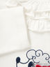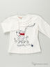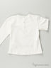 Лонгслив прямого силуэта выполнен из эластичного трикотажа средней плотности. Округлый вырез горловины, застежка на три кнопки на спинке. Полочка украшена разнообразными декоративными элементами. Вырез горловины декорирован оборками.