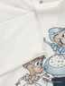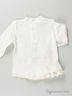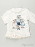 Лонгслив прямого силуэта выполнен из эластичного трикотажа средней плотности. Небольшой ворот стойка, застежка на три кнопки на спинке. Полочка украшена разнообразными декоративными элементами. Изделие декорировано оборками.