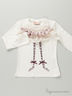 Лонгслив прямого силуэта выполнен из эластичного вискозного трикотажа средней плотности. Круглый вырез горловины, длинный рукав. Полочка украшена разнообразными оборками, принтами, стразами, пришитыми бантиками и подвеской.