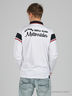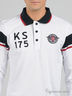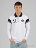 Трикотажный лонгслив из приятного на ощупь материала. Отложной воротник. На полочке планка-застежка на пуговицах. Длинные рукава, декорированные темно-синими вставками. На полочке и спине вышивка и нашивка.