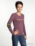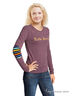 Женский лонгслив с длинными рукавами и круглым вырезом. Однотонная облегающая модель с логотипом спереди и налокотниками в разноцветную полоску.