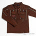 Детали: отложной ворот, застежка на три кнопки, полочка и спинка украшены нашивками, два нагрудных кармана