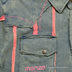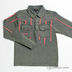 Детали: отложной ворот, застежка на три кнопки, полочка и спинка украшены нашивками, два нагрудных кармана