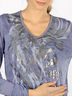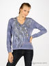 Детали: V-образный вырез горловины на трикотажной ленте; длинный рукав; полочка декорирована набивным рисунком
