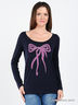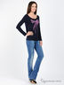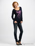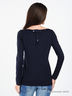 Трикотажная футболка с длинными рукавами из приятного на ощупь материала темно-синего цвета. Широкая круглая горловина. На спинке планка-застежка на пуговицах. Полочка декорирована забавным принтом.