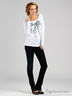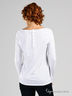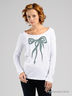 Трикотажная футболка с длинными рукавами из приятного на ощупь материала белого цвета. Широкая круглая горловина. На спинке планка-застежка на пуговицах. Полочка декорирована забавным принтом.