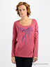 Трикотажная футболка с длинными рукавами из приятного на ощупь материала белого цвета. Широкая круглая горловина. На спинке планка-застежка на пуговицах. Полочка декорирована забавным принтом.