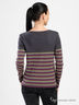 Лонгслив в разноцветную полоску в рубчик, с круглым вырезом, планкой с 3 пуговицами-"рыбками", вышитой рыбкой и стразой внизу изделия. Боковые разрезы 6 см.