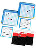 В комплекте: металлическая коробка с 4 магнитными полями - по одному на дне и на крышке и еще 2 на отдельных карточках 95х95мм, 160 круглых магнитных фишек ∅0,7см, 24 фишки кораблей.