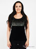 Вечерняя майка приталенного силуэта. Выполнена из бархатистой и эластичной тканей. Округлый вырез горловины. Без рукавов. Модель стильно украшена переливающимися стразами.