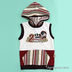 Яркая майка с капюшоном активно декорирована аппликациями и контрастными вставками.
