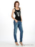 Трикотажная майка прямого кроя. Края изделия декорированы прострочкой. Глубокий вырез горловины. Передняя полочка украшена стразами и набивным рисунком.