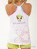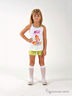 Модель прямого кроя на лямках украшена декоративной аппликацией.
