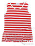 Простая и комфортная майка - неотъемлемый атрибут летнего гардероба. Свободная, трикотажная модель Cookie средней длины с бахромой в традиционной бело-красной и полосатой цветовой гамме дополнена хитрой деталью - карманом сбоку для девичьих секретиков.