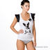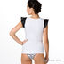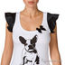 Стильная белая стрейчевая майка с принтом в виде собачки, надписью Denny Rose и бантиком спереди. Рукава свободного кроя.