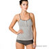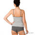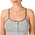 Модная серая стрейчевая майка на тонких бретелях с тремя застежками-кнопками спереди. Снизу надпись из страз Denny Ros.