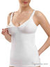 Майка для кормления из тонкой трикотажной ткани без косточек. Бюст дополнен отстегивающейся верхней частью с прорезью для кормления ребенка. Широкие эластичные, регулируемые по длине бретели. Отрезной лиф усилен плотной резинкой.