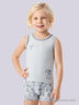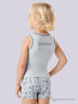 Майка для мальчиков представлена в широком размерном ряду. Модель классического кроя, полуприлегающего силуэта, удлиненного типа под заправку. Изделие выполнено из однотонного трикотажа серого цвета с тематическим принтом в стиле комиксов и надписью «Good shot!» («Хороший выстрел!») на передней детали и дополнительным текстом – на задней детали (перевод с английского: «Мне нравится играть с мячом! Ого! Косточка! Как интересно! Хороший выстрел из рогатки! Я люблю кататься на велосипеде! Я люблю летать! Я лучший пёс! Я играю с мячом! Мур…»). Высококачественный хлопок с добавлением эластана выгодно улучшает посадку модели на фигуре и снижает риск деформации при стирке.
