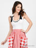 Очаровательная майка на широких бретелях с округлым вырезом горловины. Модель дополнена спереди декоративными элементами контрастной расцветки. Отличный вариант на каждый день.