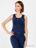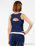Повседневная майка приталенного силуэта. Выполнена из эластичной ткани. Округлый вырез горловины. Без рукавов. Сзади оригинальный разрез в виде капли.