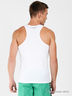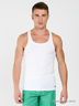 Мужская майка из тонкого эластичного трикотажа. Спинка-борцовка, круглый вырез и проймы окантованы трикотажной лентой. На спине небольшая аппликация.