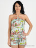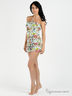 Детали: круглый вырез, короткие рукава "крылышки", полочка украшена многослойными рюшами, яркий оригинальный принт