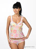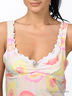 Топ из эластичного трикотажа нежного розового цвета. Глубокий вырез декольте украшен кружевным бантиком. Особенности кроя подчеркивают красоту груди.
