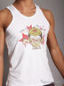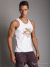 Детали: окантовка круглого выреза и пройм в виде трикотажной ленты; на полочке оригинальный рисунок