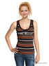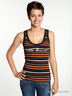 Женская майка из мягкого и нежного хлопка. Круглый вырез спереди, борцовская спинка. Облегающая модель в разноцветную полоску. Принт логотипа на груди.