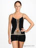 Сексуальная майка из трикотажа в рубчик. Тонкие регулируемые бретельки. Спереди шнуровка. Отрезной лиф с вертикальными вытачками. Декорирована пикантной окантовкой с леопардовым принтом.