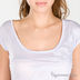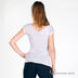 Удлиненная приталенная майка из легкого, слегка прозрачного трикотажа. Широкая круглая горловина. Короткие цельнокроеные рукава. Отрезная кокетка. Спереди по низу изделия треугольные ставки. На полочке ворсистая аппликация.