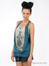 Майка женская из трикотажной ткани двух цветов, с эффектом запаха. На внутренней части майки находится принт, украшенный стразами. Бретели не отстегиваются. В боковых швах располагаются карманы. Пояс имеет фигурную форму.