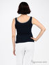 Трикотажная майка без рукавов. Вырез горловины и проймы оформлены трикотажной резинкой в белую полоску. Изделие декорировано рисунком-принтом и стразами.