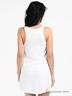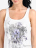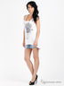 Детали: круглый вырез и пройма оторочены трикотажной лентой; спинка-борцовка; ассиметричный крой низа изделия; на полочке оригинальная аппликация со стразами