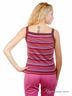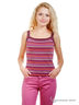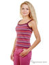 Майка в разноцветную полоску в рубчик 1x1, с однотонной окантовкой и 3 люверсами на бретелях шириной 2,5 см. Боковые разрезы 6 см для разм.50-52.