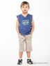 Отличная майка для мальчика из хлопчатобумажной ткани. V-образный вырез со вставкой, декорирована контрастной прострочкой и принтом.