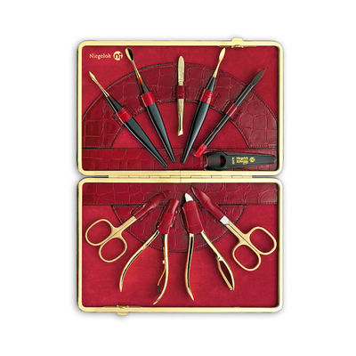10 предметов (инструменты из высококачественной стали с золотым покрытием ): маникюрные ножницы для ногтей, маникюрные ножницы для удаления кутикулы, кусачки для ногтей, кусачки для кутикулы, пинцет, пилка для ногтей с сапфировым напылением, шибер -3 шт., маникюрная палочка.