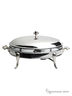 Блюдо под горячее овальной формы. Серия "Корона". Само блюдо, в котором размещается горячее, из жаропрочного стекла, и непосредственно в нем может идти процесс приготовления. Подставка из нержавеющей стали. В нижней части подставки можно установить свечи-таблетки для поддержания температуры готового блюда. Этот элемент сервировки сделает Ваш стол изысканным, а обед не забываемым.